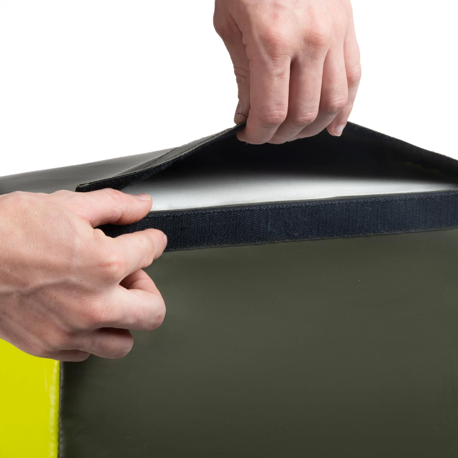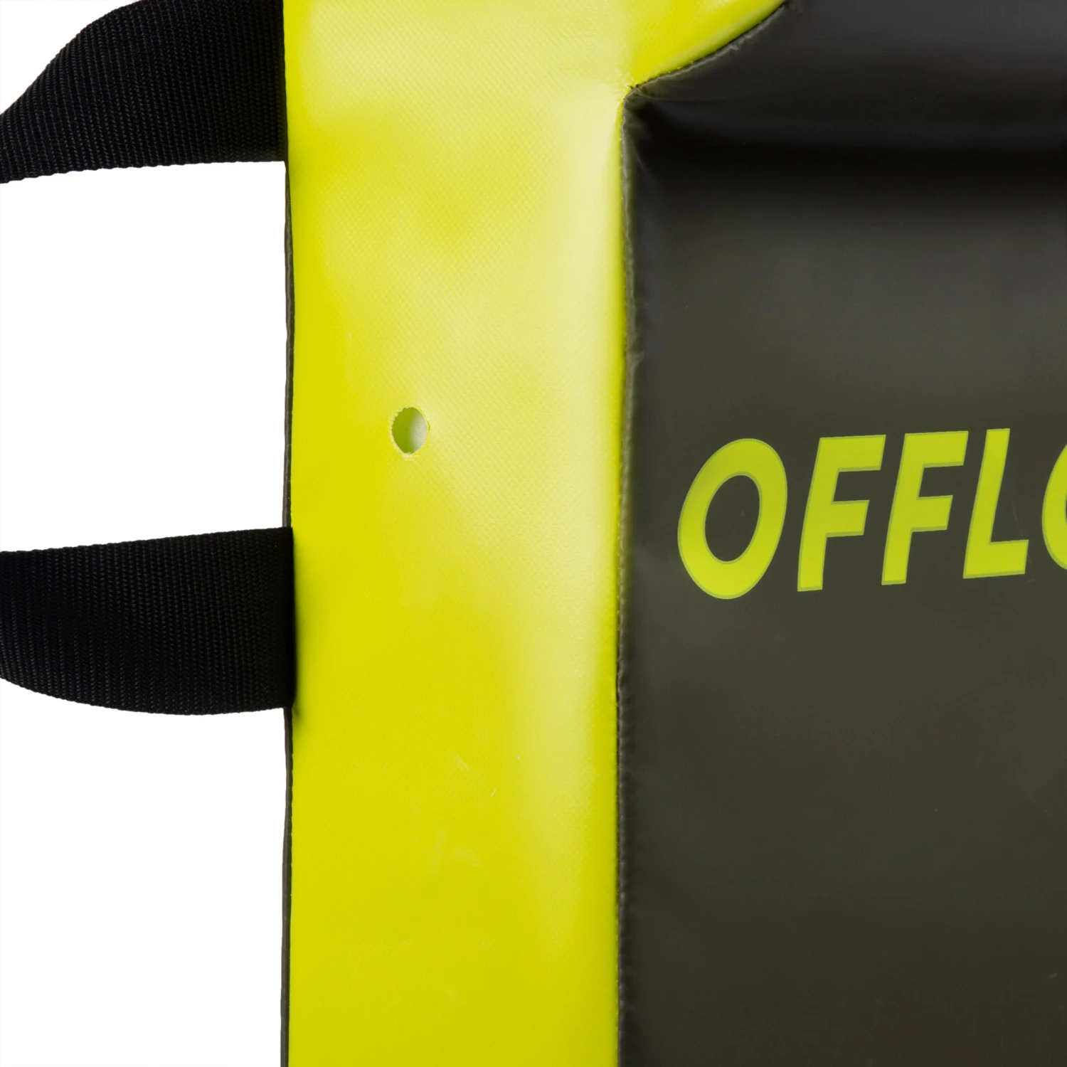 This rugby wedge has two handles on the back side and a reinforced section on the top of the front side. For your added convenience, we chose a rip-tab fastener instead of a zipper. A single block of shaped foam was used inside to better replicate game play conditions. The wedge’s dimensions are 80 x 43 x 15 cm, and it weighs 6 kg.
