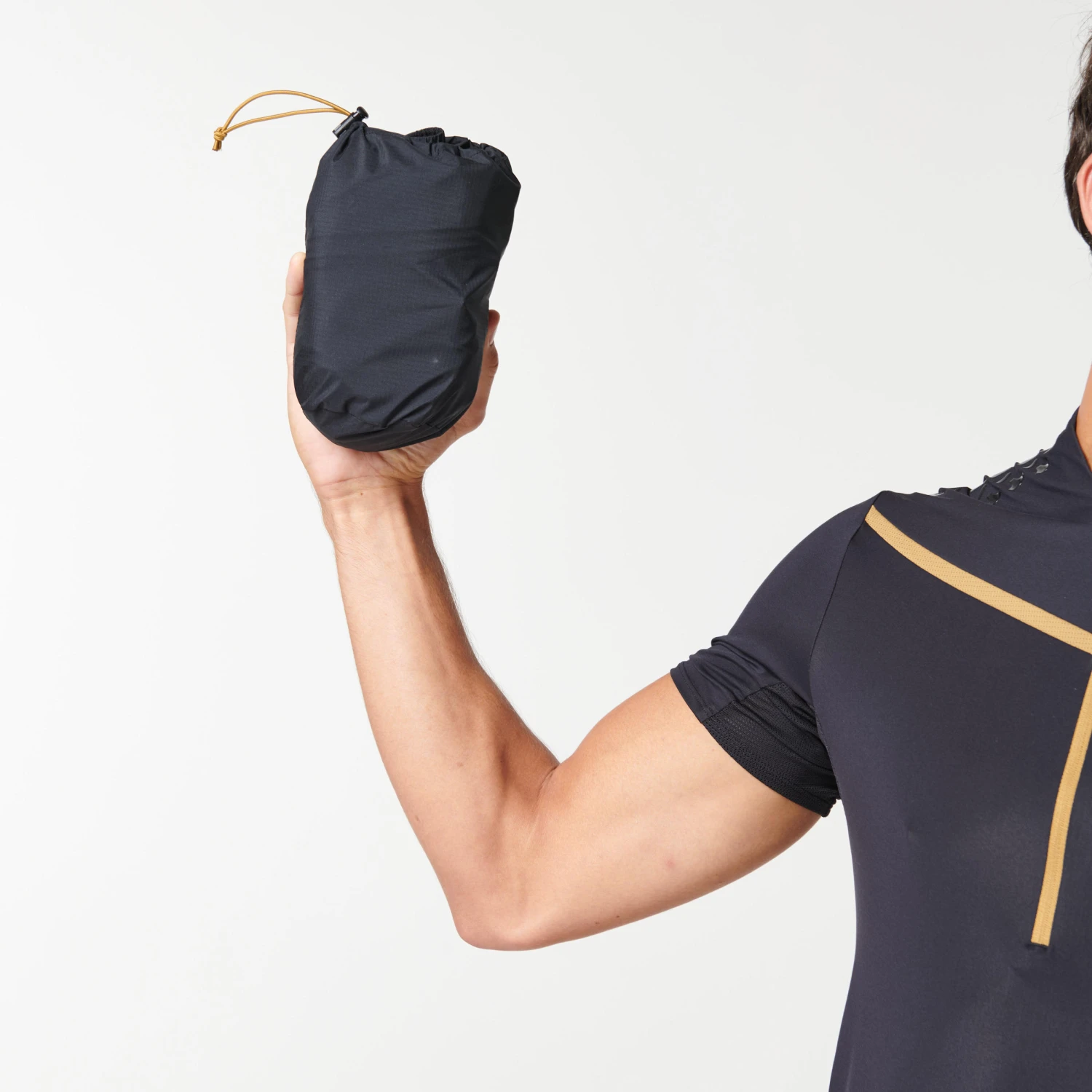 Waterproof jacket for running in rainy, windy and cold weather over every distance (training or competition). Meets the requirements of the major trail runs.Lightweight, waterproof to 10,000 Schmerbers thanks to the material and fully taped seams and easy to store at the bottom of a bag. Compliant with the waterproofing standards for ultra-trail runs.