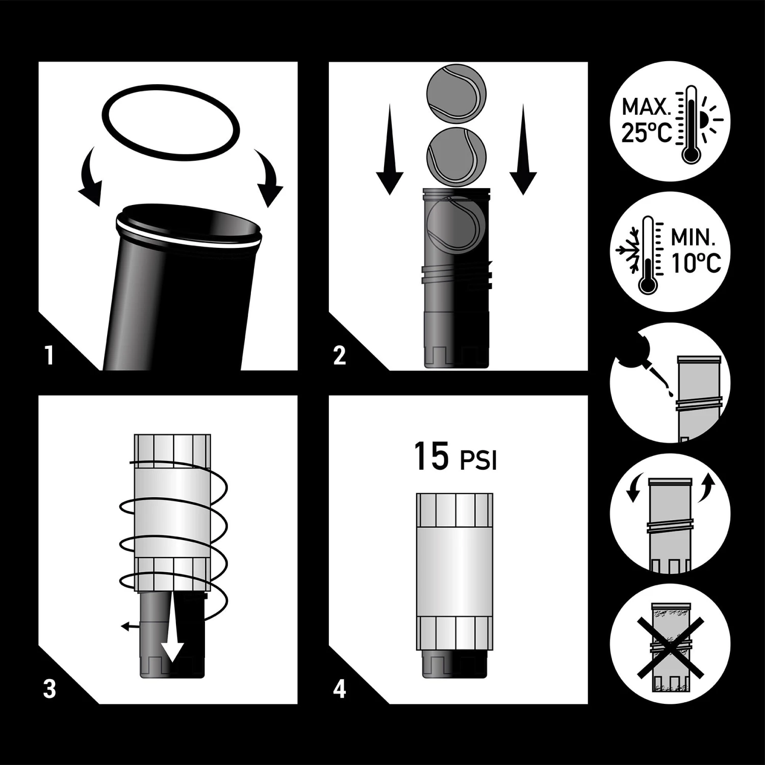 Put 3 padel balls in the cylinder and screw the cover until you reach the limit shown on the cylinder. Don’t forget to put the O-ring in place to seal the air inside the product and increase the internal pressure up to 15 PSI. By filling the empty space with compressed air, you increase the internal pressure and the balls are unable to eliminate their internal air. This maintains the original pressure until the next time the balls are used.