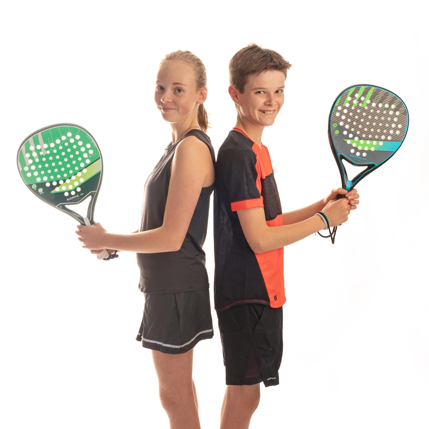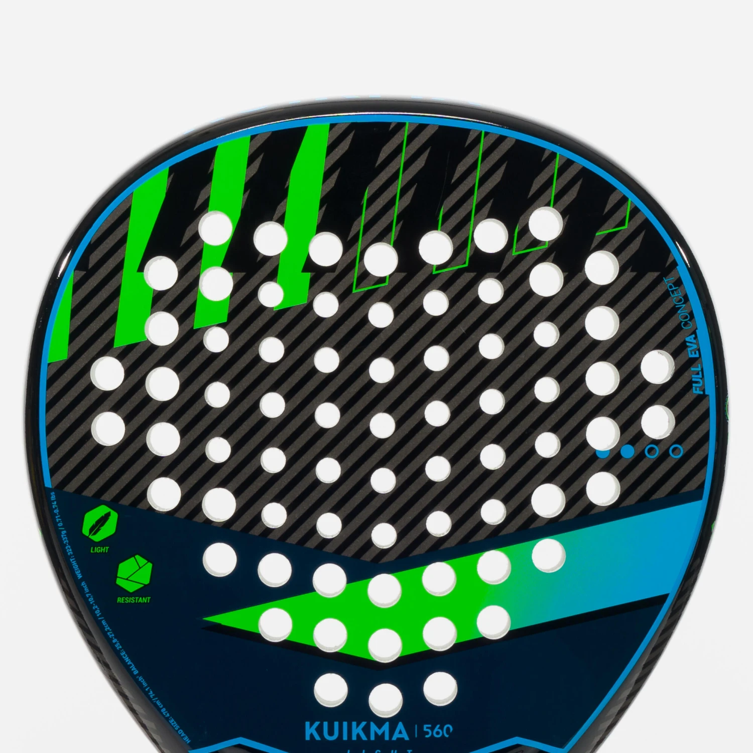 This innovation is exclusive to Kuikma, Decathlon’s padel brand. The bat is made from a single piece of EVA foam covered with a composite fibre surface. The larger EVA foam surface increases the head’s sweet spot and therefore makes it more forgiving of centring errors, resulting in better ball control.