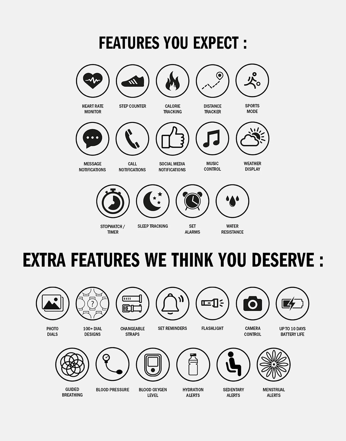 CUSTOMISABLE DISPLAY – choose your watch dial style on the home screen by pressing and holding the middle of the screen. Over 100 dial designs can be downloaded on the app, with the option to add a photo to the dial. EXTRA FEATURES – Heart rate & body temperature tracking, 9 default languages, do not disturb mode, countdown and stopwatch timer, drink water reminder, menstrual alerts and remote photo taking