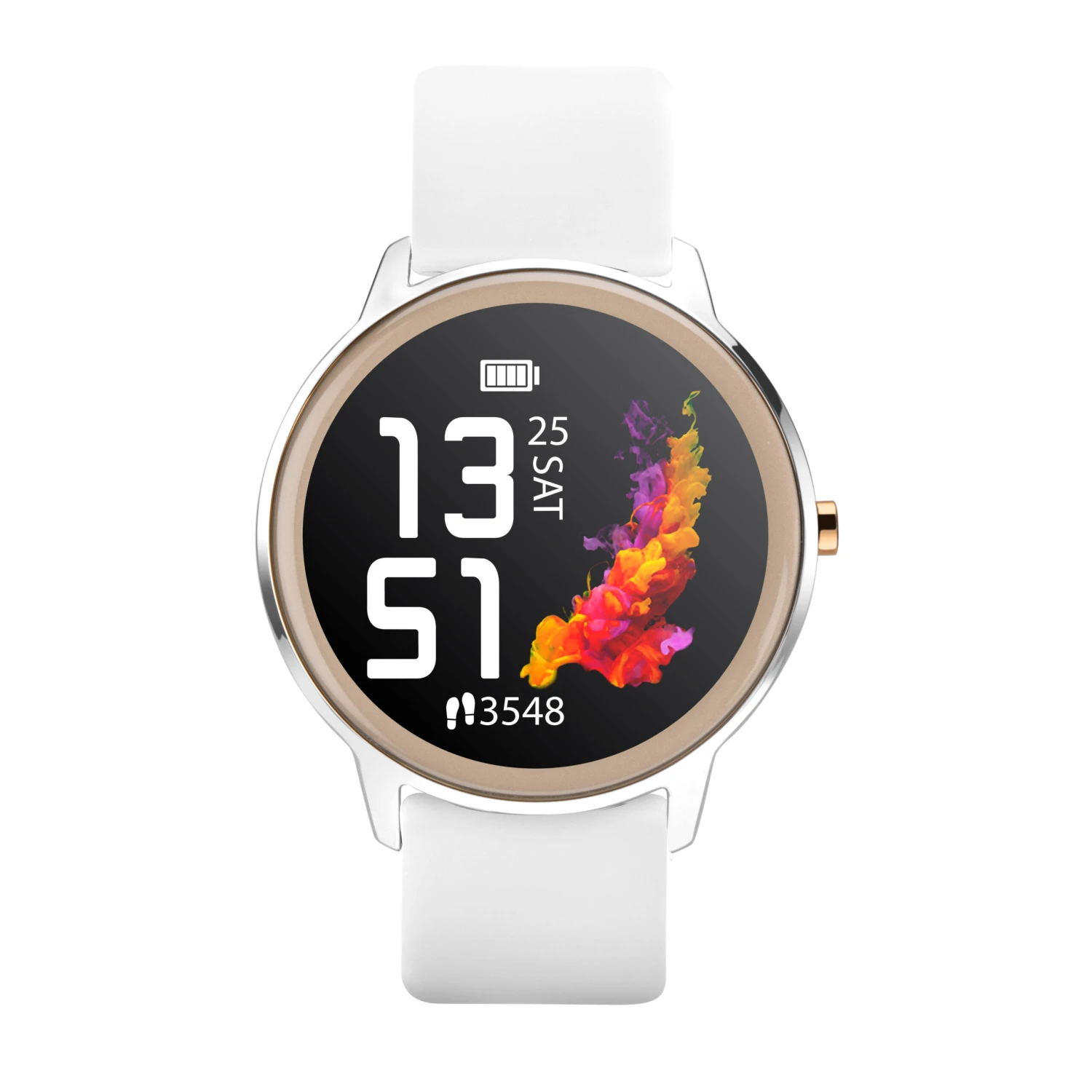 This ladies smart watch fastens with a white silicone strap. With a water resistance rating of IP67 and lots of fitness, social and entertainment features and more, the smart watch has a silver coloured case with a 1.1 inch round interactive dial.