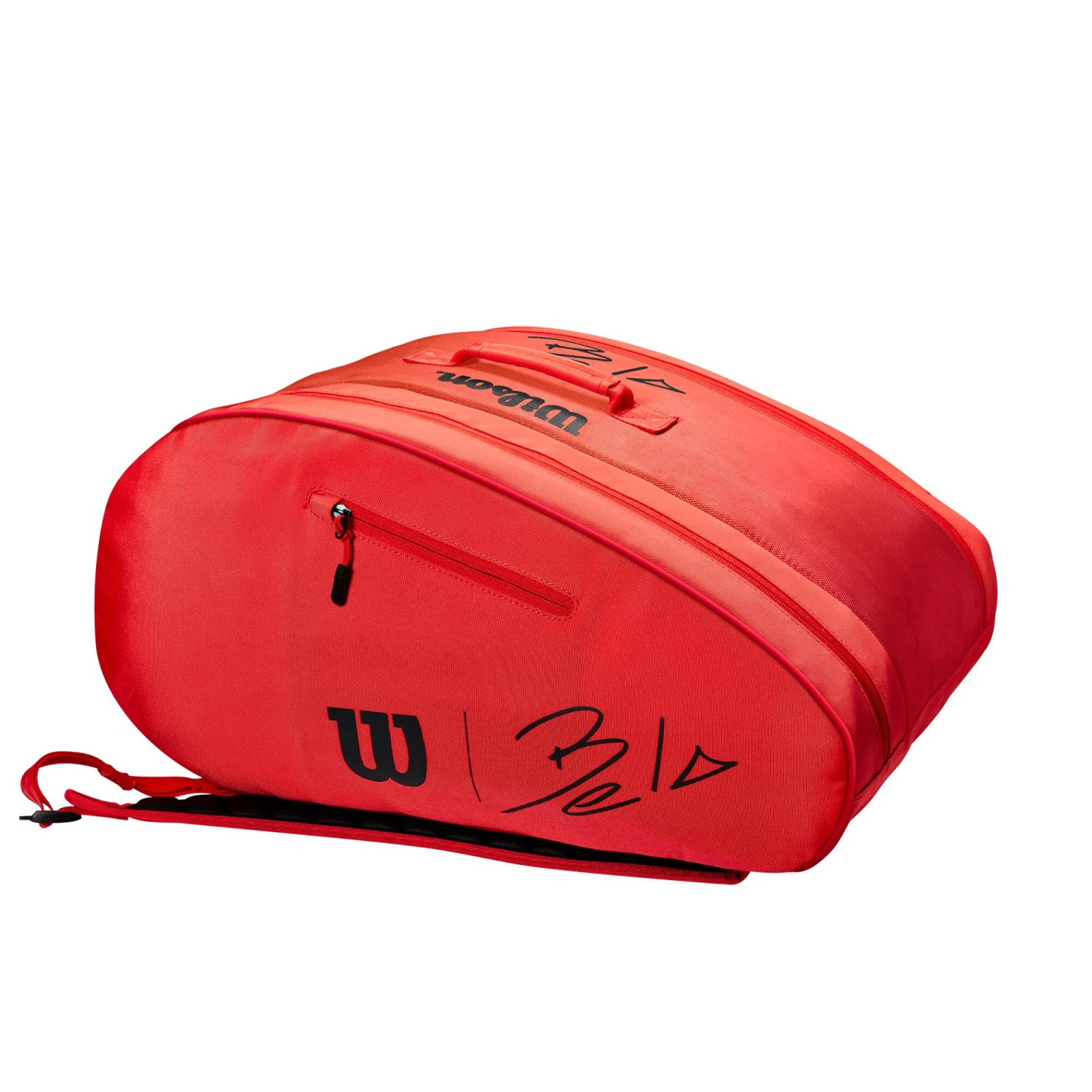 Super Tour Padel bag from Wilson adorned with a print depicting an autograph by padel pro Fernando Belasteguin, also known as Bela. In the large main compartment you can have both padel rackets and exercise clothes. In addition, there is a heat insulated compartment that protects your racket from changing temperatures. There is also a separate ventilated compartment for trainers as well as two smaller outer compartments. The padel bag has a handle at the top, but thanks to the padded shoulder straps, it can also be worn comfortably as a backpack. – Spacious padel bag from Wilson – Thermal insulation protects against temperature change – A ventilated compartment for trainers – Carry with handles or as a backpack Specifics : Color: Red Material: Polyester Dimensions: approx. 55 x 30 x 34 cm Numer of compartments: 5 Mark: Wilson Package Contains: 1x Padel bag